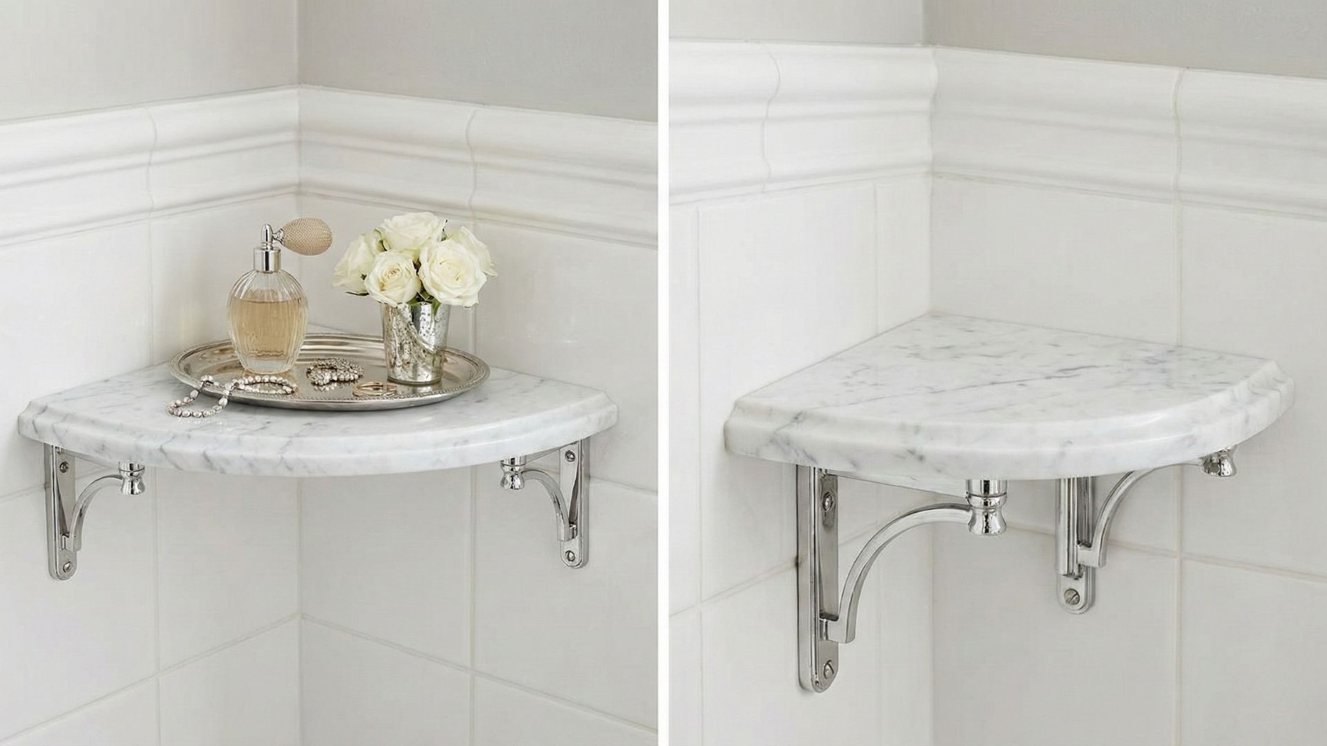 Using just one simple polished round marble corner shelf with decorative metal bracket supports would provide an elegant design feature on your corner.