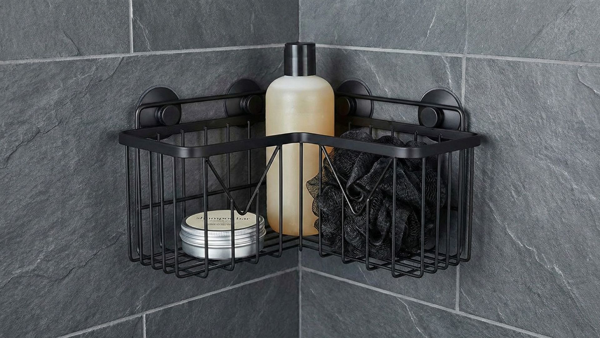 A matte black metal wire basket provides a sleek, modern, and highly functional option in the shower. This style is perfect when included in a contemporary bathroom having dark fixtures or slate tiles. The open wire construction also allows water to drain freely from the basket, which helps to prevent mold or mildew from building up on your products.