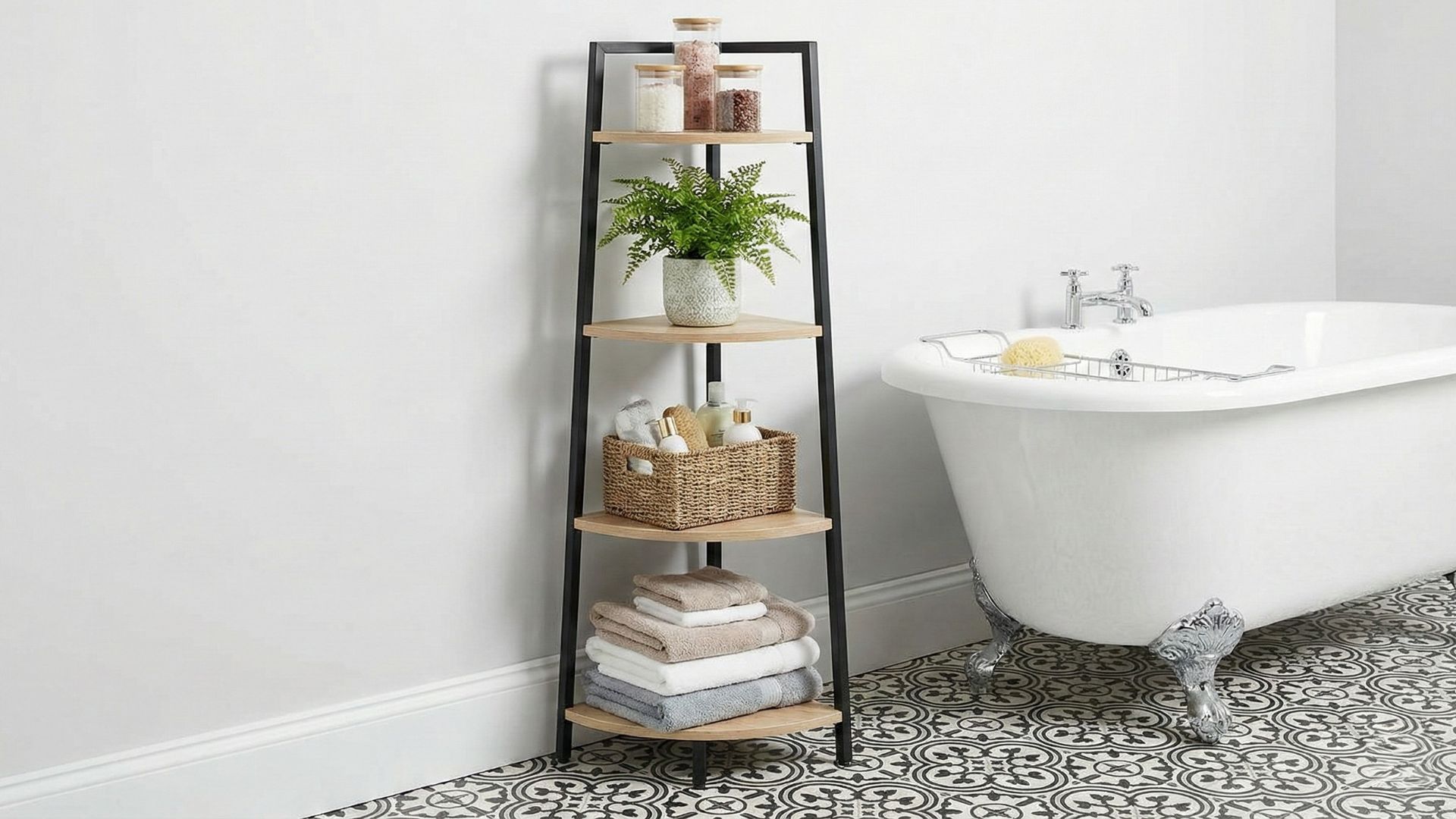 Choose a corner storage shelf stand that has mixed materials, such as wood and metal or similarly combined materials, to create visual interest in your bathroom. Use the lower shelves for storing towels and baskets, as well as using the upper shelves for decorating or putting things like frequent use toiletries on them. In addition to serving the functional purpose of storage, they also serve as decorative furniture pieces to support your other bathroom decor.